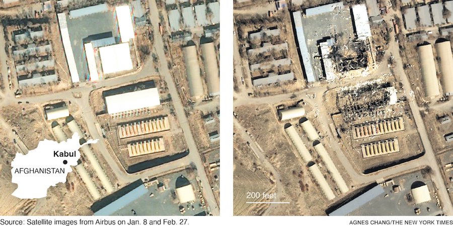 Al menos un depósito de municiones fue bombardeado en Kabul, según un militar afgano que llegó al lugar poco después y habló bajo condición de anonimato porque no estaba autorizado a hablar públicamente de los enfrentamientos. Las imágenes de satélite revisadas por The New York Times confirmaron el ataque. La emisora estatal paquistaní dijo que también había sido bombardeado un depósito de municiones en Kandahar.