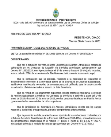 El decreto fundamenta la medida en la «necesidad manifiesta» de contar con personal para la conducción de vehículos oficiales. Sin embargo, detrás del lenguaje técnico se esconde la consolidación de una estructura de servicios personales financiada por el erario público. Los contratos, que rigen desde el 1° de enero hasta el 30 de junio, mantienen a los trabajadores bajo un régimen de «Personal Transitorio», una forma elegante de precarización que le permite al funcionario de turno manejar las altas y bajas a discreción.