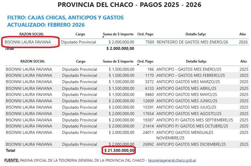 La polémica escaló cuando se revelaron documentos que detallan los montos percibidos por Bissoni en concepto de “Adelantos de Gastos” durante el último año. Los informes indican que la legisladora dispuso de una suma superior a los 21 millones y medio de pesos en los últimos 12 meses bajo esta modalidad de libre disponibilidad. Al desglosar estas cifras, se observa que la diputada contó con un “extra” promedio de aproximadamente $1.800.000 cada mes, monto que por sí solo supera la remuneración neta que intentó mostrar inicialmente ante la opinión pública chaqueña.