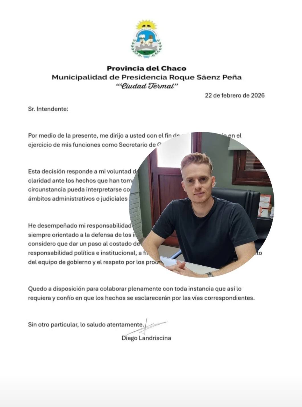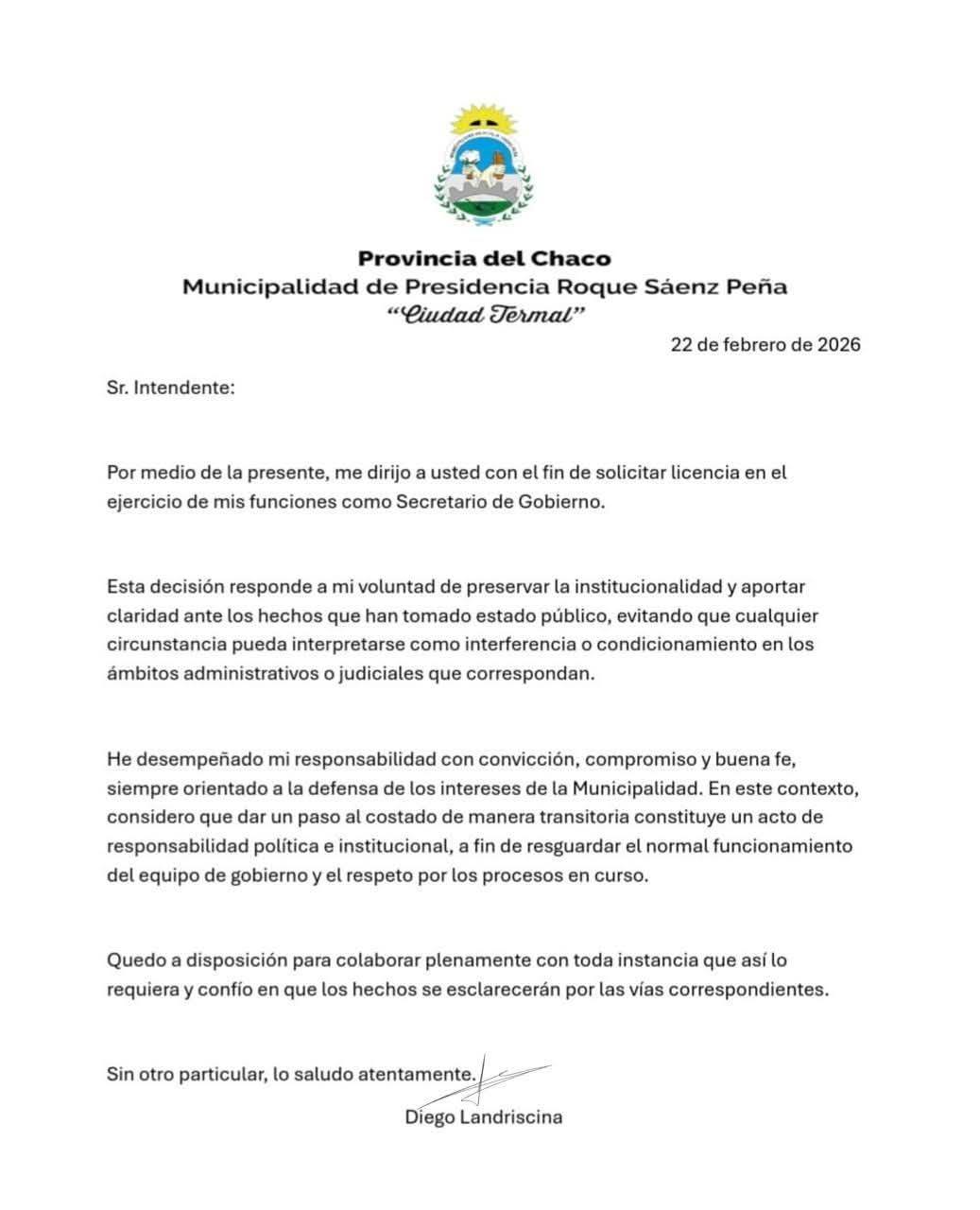 ​ Fuentes oficiales confirmaron que Diego Landriscina solicitó formalmente una licencia a su cargo como Secretario de Gobierno este domingo 22 de febrero de 2026, convirtiéndose en el primer funcionario de alto rango en dar un paso al costado tras estallar la crisis por las inversiones municipales. Quienes siguen de cerca la gestión de Bruno Cipolini interpretan esta decisión como una consecuencia directa del escándalo vinculado a la Bolsa de Comercio del Chaco, donde el municipio habría operado con fondos públicos en instrumentos de alto riesgo, generando pérdidas que, según denuncias opositoras, superarían los mil millones de pesos.