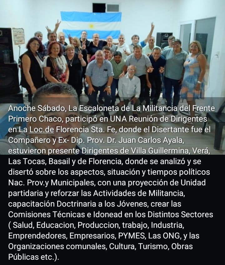 En la noche del sábado 7 de marzo de 2026, a las 21 horas, se llevó a cabo en la ciudad de Florencia, provincia de Santa Fe, una importante charla política bajo las consignas “Proyectando el 2027” y “Los nuevos liderazgos”, en un encuentro que reunió a dirigentes y militantes del norte santafesino y de la región chaqueña.